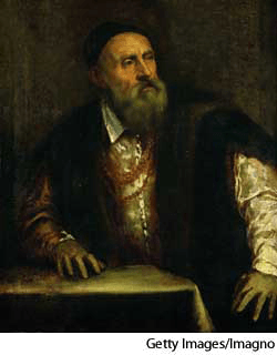 Ti·tian AHD[tĭshʹən] 原名 提香诺·威塞利奥(1488?-1576) D.J.[ˈtɪʃən]K.K.[ˈtɪʃən]NONE(无词性) Titianc. 1562 self-portrait- Italian painter who introduced vigorous colors and the compositional use of backgrounds to the Venetian school. His works include the altarpieceThe Assumption of the Virgin (1518). 提香:意大利画家,他把鲜明的色彩和背景的混合使用带入了威尼斯画派。他的作品包括圣坛背壁装饰画《圣母升天》 (1518年)