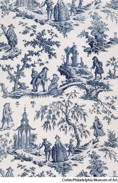 toile de Jouy AHD[də zhwēʹ] D.J.[də ˈʒwiː]K.K.[də ˈʒwi]n.(名词)【复数】 toiles de Jouy[twäl]  toile de Jouydetail of a c. 1770 British fabric for bed hangings - A usually light-colored fabric printed with a scenic pattern or design often used in upholstery or for curtains.淡底印花布:一种通常为淡色的印有风景花样或图案的织物,经常用于作家具套或窗帘