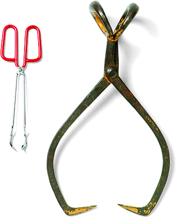 tongs AHD[tôngz, tŏngz] D.J.[tɔːŋz, tɒŋz]K.K.[tɔŋz, tɑŋz]pl.n.(used with a sing. or pl. verb)(复数名词)(与单数或复数动词连用) left to right: kitchen and block ice tongs© School Division, Houghton Mifflin Company- A grasping device consisting of two arms joined at one end by a pivot or hingelike scissors.钳,火钳:一种用来抓取的工具,由通过枢轴或枢状剪结合于一端的两臂组成