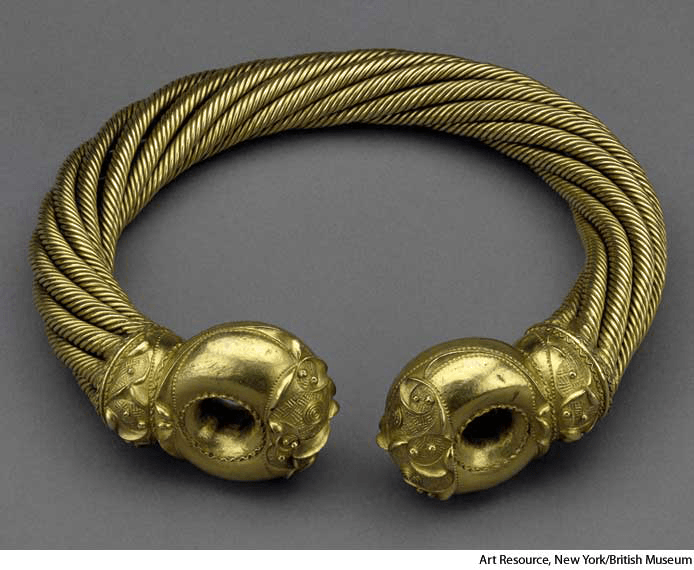 torquʹer n.(名词)torqueʹy adj.(形容词) torque 2 AHD[tôrk] D.J.[tɔːk]K.K.[tɔrk]n.(名词) torque2c. 75 bc Celtic gold Great Torc of Snettisham- A collar, a necklace, or an armband made of a strip of twisted metal, worn by the ancient Gauls, Germans, and Britons.金属饰环:由一串弯曲的金属制成的项圈,项链或手环,古代高卢人,日尔曼人和不列颠人戴这种手饰