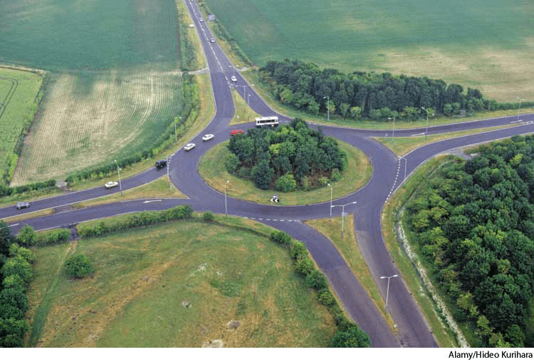A circular one-way road at a junction of thoroughfares, facilitating an uninterrupted flow of traffic.