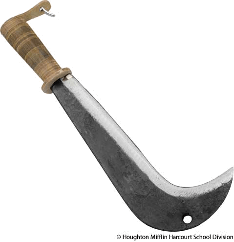 An implement with a curved blade attached to a handle, used especially for clearing brush and for rough pruning.
