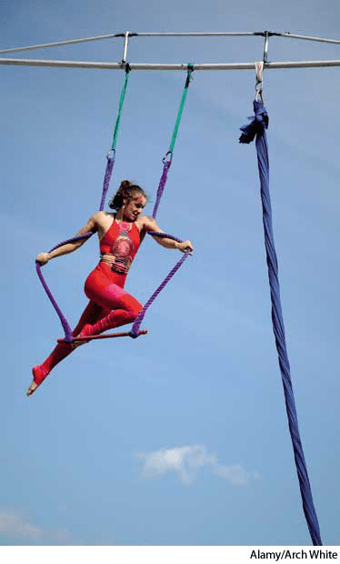 tra·peze AHD[tră-pēzʹ, trə-] D.J.[træˈpiːz, trə-]K.K.[træˈpiz, trə-]n.Sports(名词)【体育运动】 trapeze- A short horizontal bar suspended from two parallel ropes, used for exercises or for acrobatic stunts.吊架:一根从两根平行的绳子悬挂下来的水平的短棍,用于体育锻炼或杂技表演