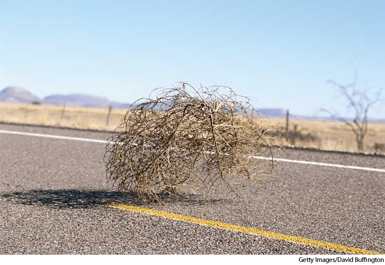 tum·ble·weed AHD[tŭmʹbəl-wēd'] D.J.[ˈtʌmbəlˌwiːd]K.K.[ˈtʌmbəlˌwid]n.(名词) tumbleweed- Any of various densely branched annual plants, such as amaranth and Russian thistle, that break off from the roots at the end of the growing season and are rolled about by the wind.广布苋,风滚草:多种枝条茂密的一年生植物中的一种,如苋和细叶钾猪毛菜,在植物生长期的末期,从根部脱离,被风吹动,在田野里滚动