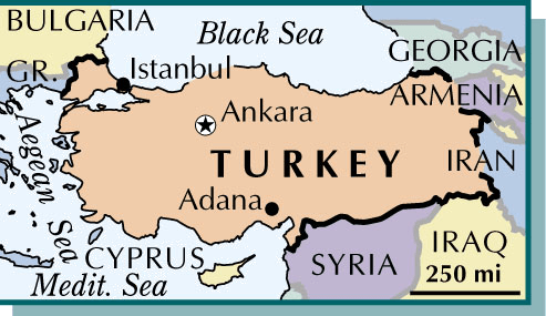Tur·key AHD[tûrʹkē] abbr.缩写 Tur.,Turk.D.J.[ˈtɜːkiː]K.K.[ˈtɝki]NONE(无词性) - A country of southwest Asia and southeast Europe between the Mediterranean and the Black seas. One of the oldest inhabited regions in the world, Turkey was the center of the Ottoman Empire for more than 600 years. Its modern history dates to the rise of the Young Turks (after 1908) and the collapse of the empire in 1918. Under the leadership of Kemal Atatürk, a republic was proclaimed in 1923. Ankara is the capital and Istanbul the largest city. Population, 44,736,957.土耳其:一个跨越亚洲西南部和欧洲东南部的国家,位于地中海和黑海之间。土耳其是世界上最古老的居住区之一,曾作为奥斯曼帝国的中心繁荣了600年。土耳其的现代历史开始于“青年土耳其党”的崛起(1908年以后)和1918年奥斯曼帝国的崩溃。在卡穆尔·阿塔蒂尔克的领导下,1923年共和国宣告成立。安卡拉是首都,伊斯坦布尔是第一大城市。人口44,736,957