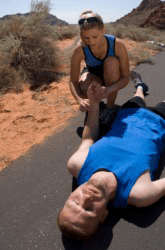 A woman assists an unconscious man.
