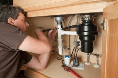 A man works on the plumbing under a sink.
