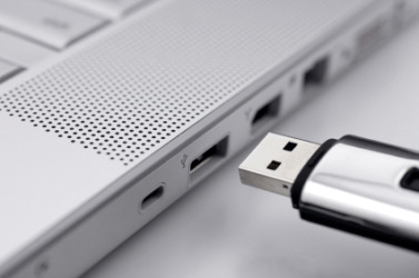 A USB device being inserted into a USB port.