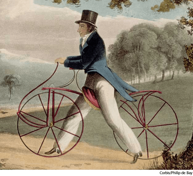 - An early bicycle propelled by pushing the feet along the ground while straddling the vehicle.脚蹬车:一种骑车时用双脚踩踏推动车前进的早期自行车