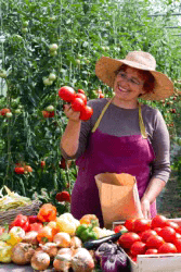 A vendor sells tomatoes at a farmer's market.