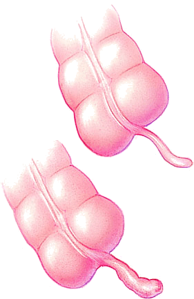 vermiform appendixn.(名词) healthy appendix extending from the large intestine (top); an inflamed appendix (bottom)Carlyn Iverson- A narrow vestigial process projecting from the cecum in the lower right-hand part of the abdomen of some mammals, including human beings. Also called vermiform process 阑尾:从位于某些哺乳动物,包括人类的腹部右下部的盲肠中突出的狭窄退化了的突起 也作 vermiform process