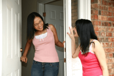 A woman welcomes a visitor.