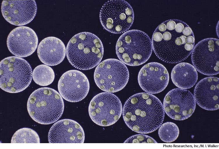 vol·vox AHD[vŏlʹvŏks', vôlʹ-] D.J.[ˈvɒlˌvɒks, ˈvɔːl-]K.K.[ˈvɑlˌvɑks, ˈvɔl-]n.(名词) volvox- Any of various freshwater green algae of the genusVolvox that form hollow, spherical multicellular colonies. 团藻:一种团藻 属淡水绿藻,形成空的、球状的多细胞群落
