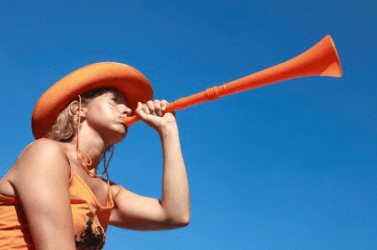 A young woman blows a vuvuzela.