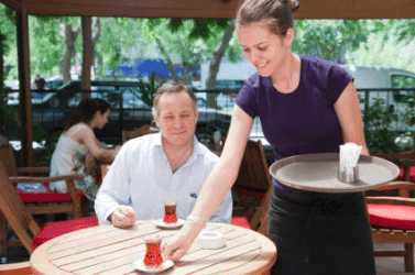 A waitress serving tea.