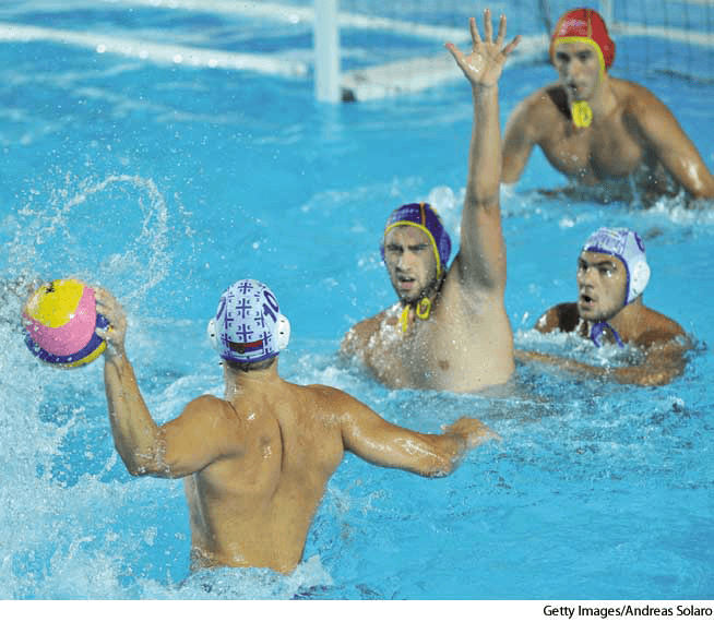 水球:水中运动,两队游泳者都努力将球投进对方的球门