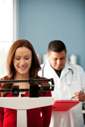 A doctor checks a woman's weight.
