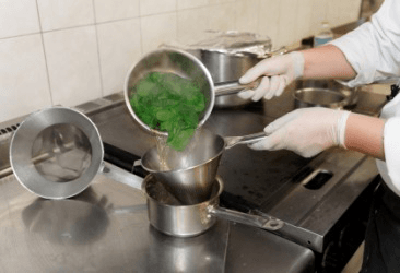 A chef blanches fresh spinach.