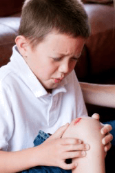 A boy has scraped his knee and made it bleed.