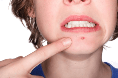 A girl pointing to a blemish on her chin.