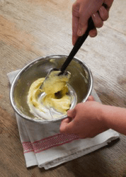 A woman blends cake ingredients together.