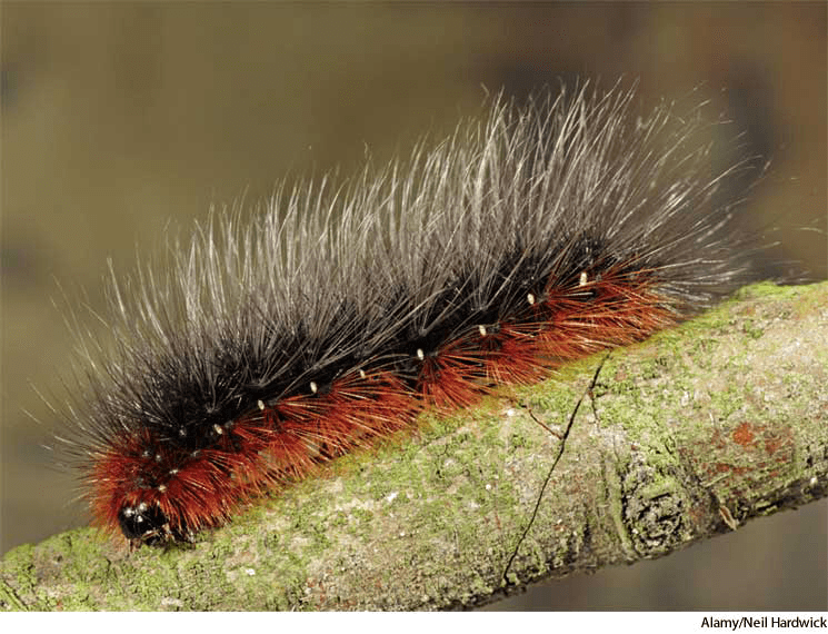 1. The hairy caterpillar of any of various moths, especially that of the North American tiger mothIsia isabella, having a reddish-brown middle stripe and black at either end. 灯蛾毛虫:一种蛾的毛状的毛虫,尤指北美的伊沙贝拉蛾属 的灯蛾,有褐红色的居中的条纹,两末端呈黑色