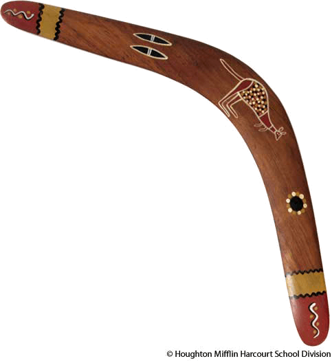 注释- The words we have borrowed from native languages of Australia,such asbillabong, budgerigar, dingo, kangaroo, koala, kookaburra, waddy, and wallaby, generally have the exotic sound of down under, andboomerang is no exception. In a book about the languages of New South Wales published in 1790 is found the native termboo-mer-rit, glossed "the scimitar,” because of the curved shape of the boomerang.In 1825 in a passage containing the first recorded instance of the English formboomerang we are told it is "a short crested weapon which the natives of Port Jackson [now part of Sydney] project with accurate aim into a rotary motion.”In 1827 another commentator says that this term "may be retained for want of a more descriptive name.”我们从澳大利亚本土语言借来的单词,比如billabong(死水潭),budgerigar(虎皮鹦鹉),dingo(骗子),kangaroo(袋鼠),koala(树袋熊),kookaburra(笑翠鸟),waddy(木棍) 以及 wallaby(沙袋鼠) 等, 一般都有来自异国的声音,boomerang 也不例外。 1790年出版的一本关于新南威尔士的语言的书中有个本土词汇boo-mer-rit, 意为“偃月刀”,是因为其回飞镖的弯形。在1825年的一篇短文中有boomerang 的英语形式的最早记录, 我们被告知那是“一种杰克森港[今悉尼的一部分]土著设计的带有饰章的短武器,能在旋转运动中精确击中目标。”1827年另一位评论者说这个词汇“由于缺少一个更富描述性的名字可以保留”