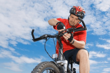 A man adjusts the handlebars on his bicycle.