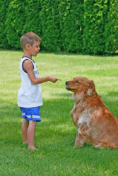A boy gives his dog an admonition.