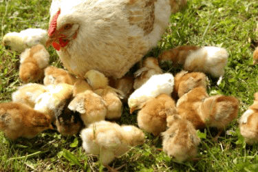 A mother hen and her brood of baby chicks.