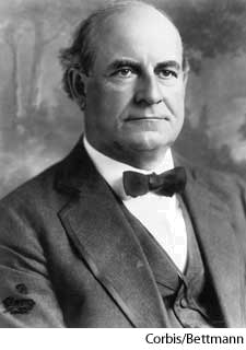 1. American lawyer and politician who campaigned unsuccessfully for the presidency in 1896, 1900, and 1908. He is famous for his impassioned "Cross of Gold" speech advocating free silver (1896) and for his defense of fundamentalism in the Scopes trial (1925).布赖恩,威廉·詹宁斯:(1860-1925) 美国律师,政治家,分别于1896年,1900年和1908年竞选总统,均告失败。他在充满激情的演说“黄金十字架”中提倡银币自由铸造,还曾为斯科普斯审判案中基要主义作过辩护