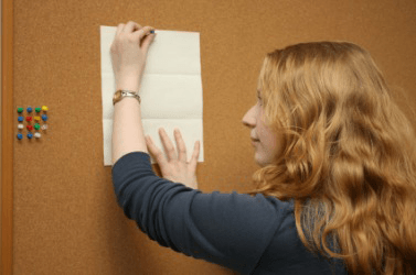 A woman posting a bulletin on a bulletin board.