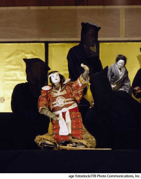 Bun·ra·ku AHD[b‹n-räʹko͞o, b‹nʹrä'-] D.J.[bʊnˈrɑːkuː, ˈbʊnˌrɑː-]K.K.[bʊnˈrɑku, ˈbʊnˌrɑ-]n.(名词) Bunrakupuppets and their puppeteers (shrouded in black)- A traditional Japanese puppet theater featuring large puppets operated by on-stage puppeteers with a narrative recited from off-stage. The puppets have heads, hands, and feet of wood attached to a bodiless cloth costume.文乐木偶戏:日本传统木偶剧,由台上操纵与人一般大小的木偶的操纵人员与幕后叙述者配合表演。木偶有木质的头,手和脚,虽然无躯体却以布质服饰相连接