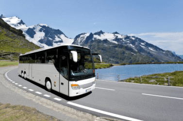 An autobus, or bus, on a highway.