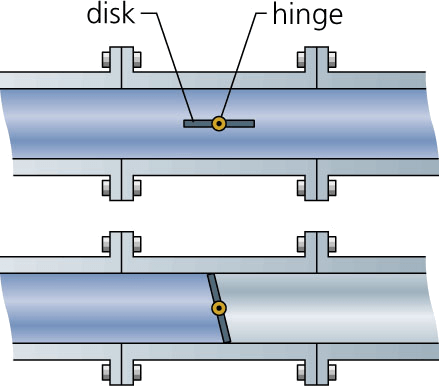 - A valve composed of two semicircular plates hinged on a common spindle, used to permit flow in one direction only.蝶形阀:由附在一个共用轴上的两个半圆片组成的阀门,用于限制向一个方向的流动