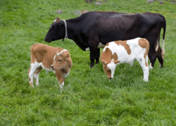 A mother cow with two calves.