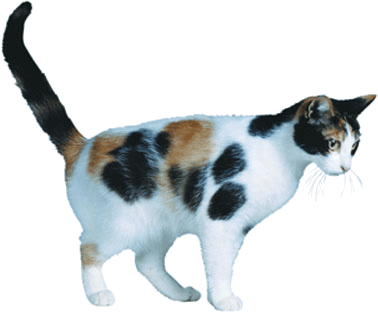 1. An animal, such as a cat, having a coat that is mottled in tones of white with red and black.带斑纹动物:一种有白色夹杂红色和黑色斑纹皮毛的动物,如猫