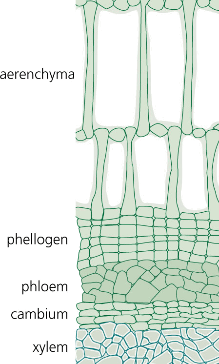 aer·en·chy·ma AHD[â-rĕngʹkə-mə] D.J.[eəˈreŋkəmə]K.K.[ɛˈrɛŋkəmə]n.(名词) longitudinal section of an aquatic plant stemPrecision Graphics- A spongy tissue with large air spaces found between the cells of the stems and leaves of aquatic plants, providing buoyancy and allowing the circulation of gases.通气组织:空气所占空隙很大的多孔组织,存在于茎部细胞以及水生植物叶片之间,提供浮力以及疏通空气流通