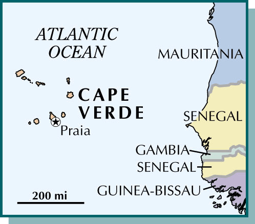 Cape Verde AHD[vûrd] abbr.缩写 C.V.D.J.[vɜːd]K.K.[vɝd]NONE(无词性) - An island country of the Atlantic Ocean west of Senegal. The islands were settled by the Portuguese in the mid-15th century, became a colony in 1495 and an overseas province in 1951, and gained independence in 1975. Praia, on São Tiago Island, is the capital. Population, 296,093.佛得角:大西洋中的一个岛国,位于塞内加尔以西。15世纪中期葡萄牙人在此定居,1495年成为一个殖民地并于1951年成为一个海外省,1975年赢得独立。位于圣地亚哥岛的普拉亚是首都。人口296,093
