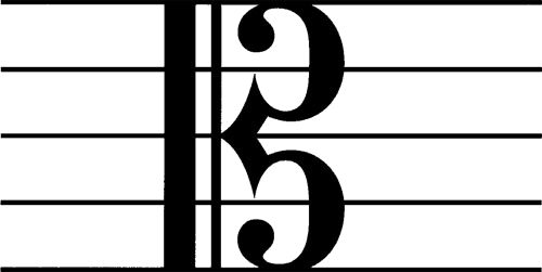 1. A symbol indicating which line of a staff represents the pitch of middle C. On the bottom line it becomes the soprano clef, on the middle line the alto clef, and on the third line above the bottom the tenor clef.C谱表:表明五线谱中代表高中音C的那一行符号。在第一线上时,它是高音部谱号,在第三线上时,是中音部谱号,在第四线时是次中音部谱号
