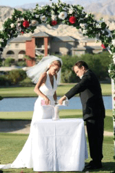 A couple participating in the sand ceremony at their wedding.