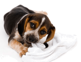 A puppy chewing on a sock.