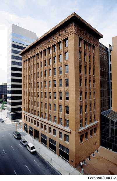 Chicago Schooln.(名词) Chicago School1890-1891Wainwright Building, designed by Louis H. SullivanSt. Louis, Missouri- A group of U.S. architects of the late 19th to early 20th century, including William Le Baron Jenney and Louis Sullivan, noted for their utilitarian designs and their use of steel framing as a skeleton for multistory buildings.芝加哥学派:十九世纪末到二十世纪初的一群美国建筑家。包括威廉·李男爵、詹尼和刘易斯·苏利文。他们以实用主义的设计和使用钢筋结构来做多层建筑的框架而闻名