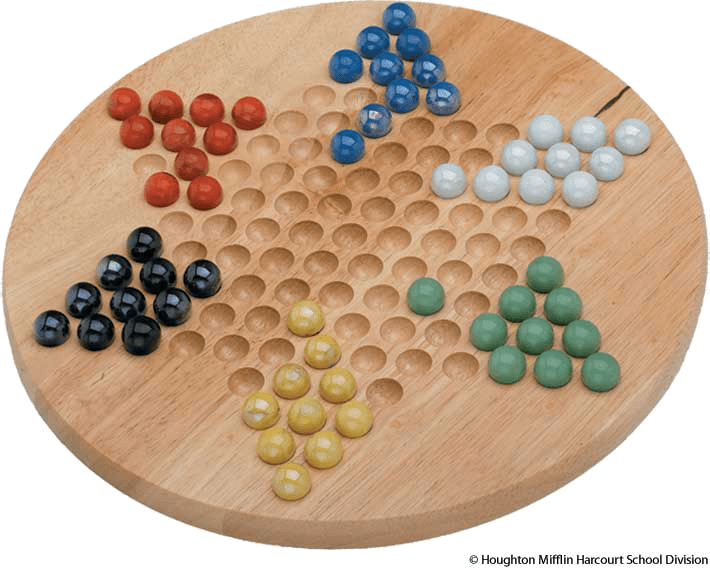 A board game in which each player tries to move a set of marbles arranged in holes from one point of a six-pointed star to the opposite point by means of single moves or jumps.中国跳棋:一种棋盘游戏,每位棋手都尽量将排列在小洞中的玻璃弹子通过单格移动或跳动,从六角星棋盘的一端移至相对的另一端