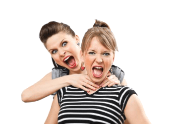 A woman pretends to choke her friend.