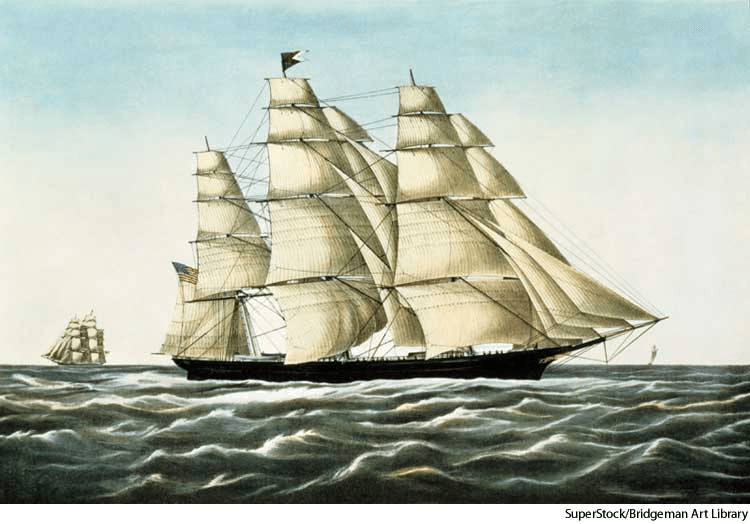 - Nautical A sharp-bowed sailing vessel of the mid-19th century, having tall masts and sharp lines and built for great speed.【航海】 快速帆船:19世纪中期一种尖船头的海船,船桅高、流线型,为高速行驶而建造