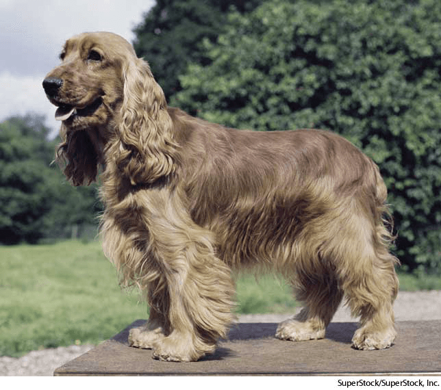 A dog of a breed originally developed in England, having long, drooping ears and a variously colored silky coat.