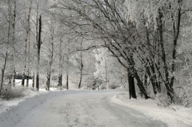 It would be very cold walking down this snowy road.
