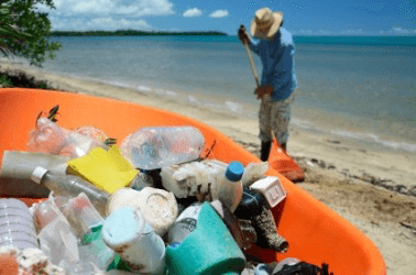 A man collects trash on the beach.