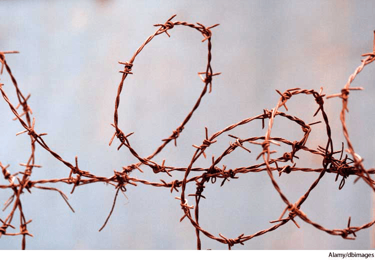 Barbed wire that is extended in a spiral for use as a barrier, as on a fence.